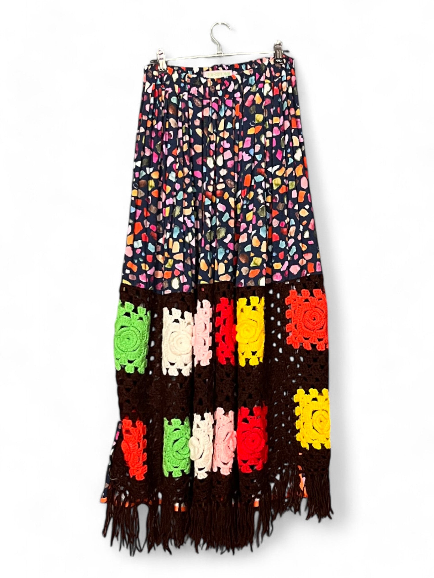 Patchwork Skirt with Multicolor Print and Crochet Panels